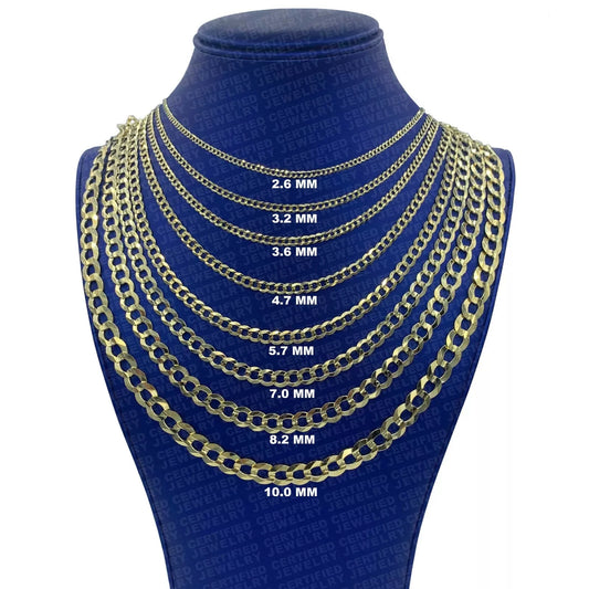 14K Solid Yellow Gold Curb Cuban Link Chain Necklace, 2.6mm to 10mm Wide