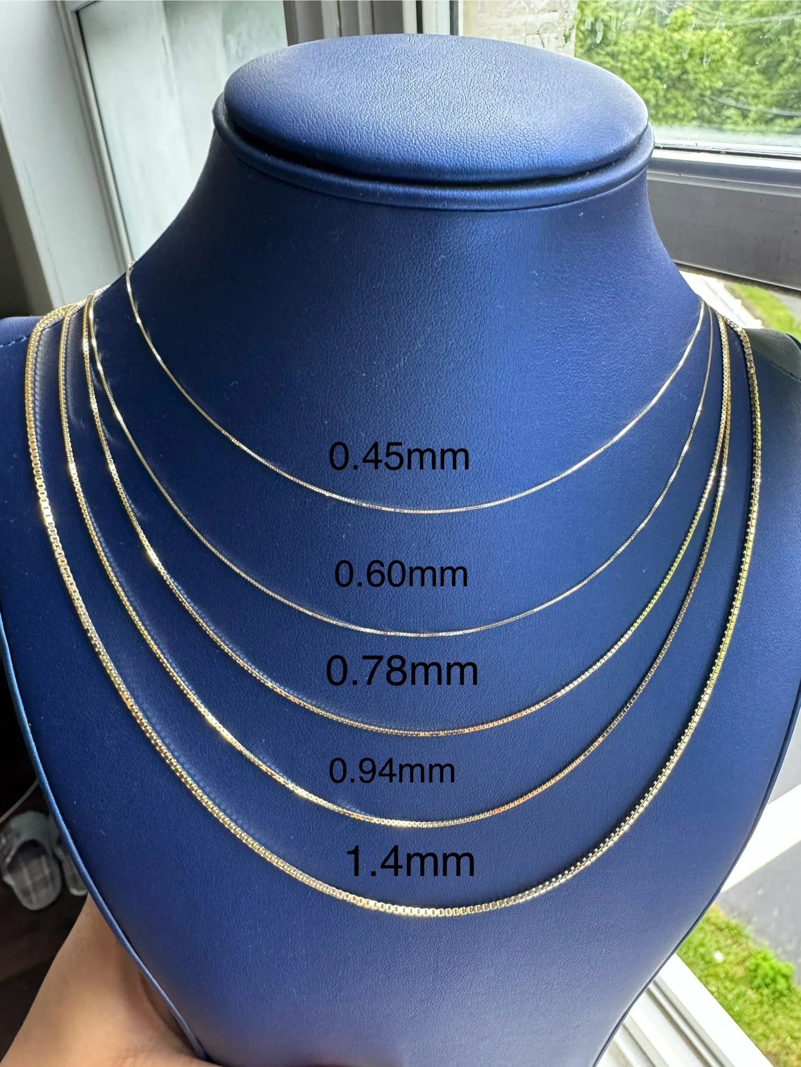 10K Solid Yellow Gold Box Chain Necklace, 0.5mm To 1.4mm Wide