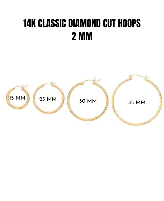 14k Gold Classic Diamond Cut Hoop Earrings, 2mm
