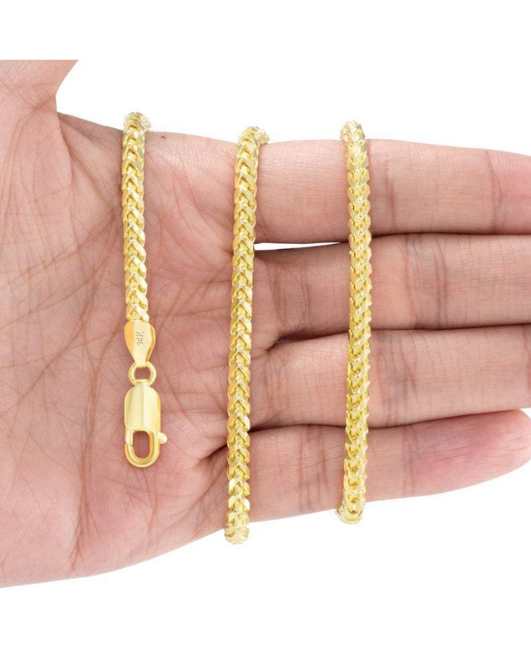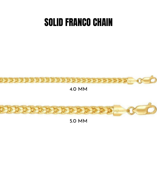 This 14k yellow gold solid franco necklace chain offers a modern necklace look. At a 4.0MM - 5.0MM thickness, this chain is available in an 24", 26", 30" length. Perfect for pendants and can also be worn alone. Includes a lobster clasp to uphold strength and comfort.
