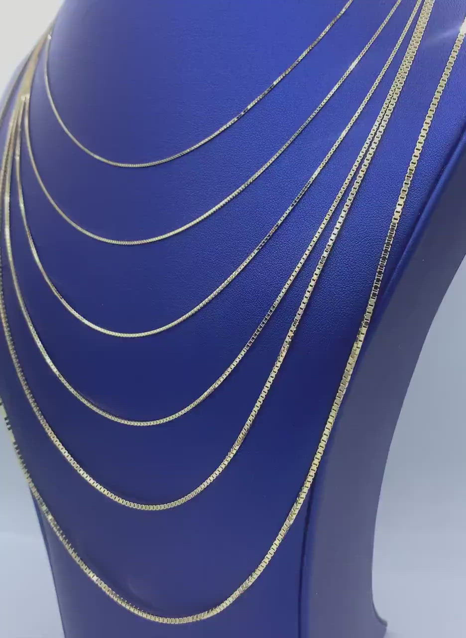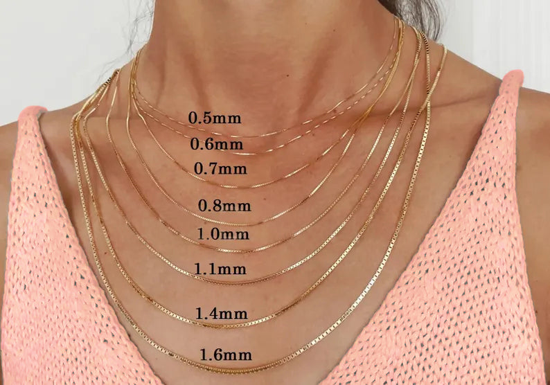 Solid 14K Yellow Gold Box Chain Necklace, 0.8mm To 1.6mm Wide